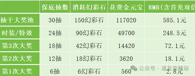 本次抽奖分为基础池和幻彩池,在基础池抽中5%的幻彩后,就会从幻彩池中随机获得一件奖品(染色时装概率1.5%)。也就是说,一发入魂的概率只有0.075%!不仅如此,官方还特别增加了首次免费抽必定不出大奖的规则,彻底杜绝了白嫖的可能,运气再好也得氪金!
