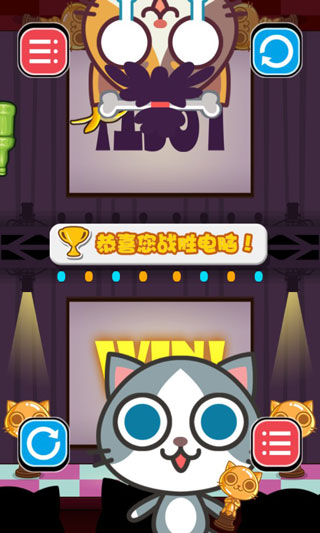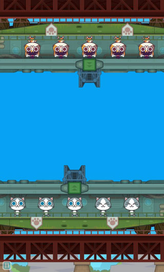 游戏中的主角是非常可爱的喵星人,它们有着大大的眼睛,整个脑袋比身体还大,很明显的夸张类卡通绘画方式。游戏采用了相对反向的画面呈现,我们的屏幕分为两个区域,上下各为不同的区域,相互反向,这样刚好两个人就能对面而坐。游戏画面风格非常清新秀气,再加上可爱的喵星人会有各种不同的表情,让残酷的挑战也变得充满了搞怪的趣味。